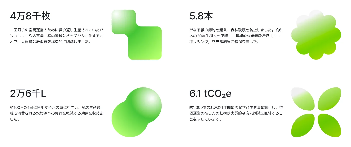 樹木6本を守ったデジタルキュレーション: パンフレットや案内資料を100%デジタル化しました。約4万8千枚以上の紙消費を抑制し、これは約6本の樹木を保護したことと同等の効果です。
