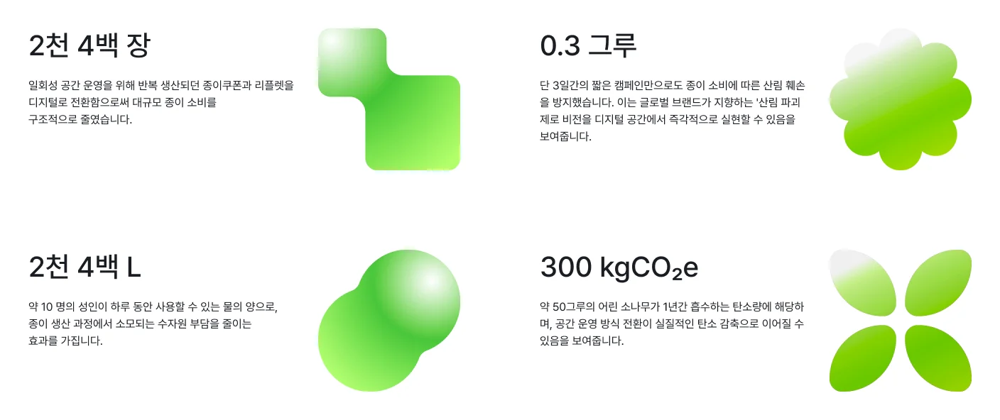 이동 거리 26,000km의 절감: 디지털 팝업에 접속한 유저들이 오프라인 현장을 직접 방문하는 대신 화면 속에서 360도 뷰어와 히든 미션을 즐김으로써, 총 26,065km의 이동 거리를 단축했습니다. (왕복 이동거리 13km 기준) 이는 지구 약 0.6바퀴를 아낀 것과 같은 탄소 저감 효과입니다.