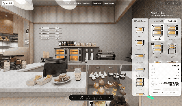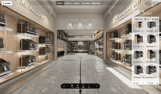 This is not a product photo gallery. Visitors enter the showroom, select the type of themed space they want to explore — a barista bar, a snack counter, a pizza kitchen — and see exactly how each brand's flagship equipment looks within a real interior context. In real time.
