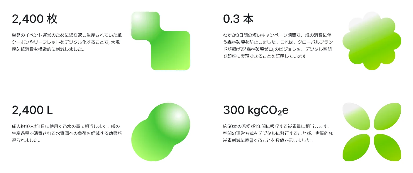 移動距離26,000kmの削減: デジタルポップアップにアクセスしたユーザーが、オフライン会場を直接訪問する代わりに、画面の中で360度ビューアーやミッションを楽しんだことで、合計26,065kmの移動距離を短縮しました。(往復移動距離13km基準)これは、地球を約0.6周したのと同等の炭素削減効果です。